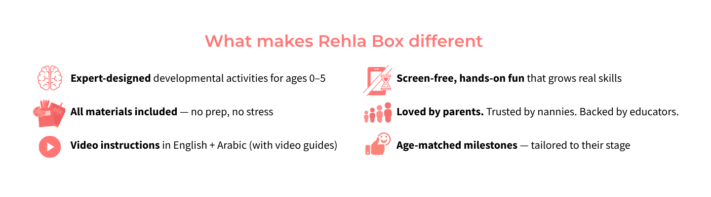 يتضمن كل صندوق كتيبات ثنائي اللغة (عربي + إنجليزي) مع رموز الاستجابة السريعة QR لفيديوهات توضيحية تساعد الأهل على متابعة النشاطات بسهولة، بدون تحضير أو توتر.